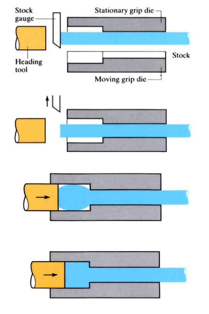 Upset forging process is ideal for longer shapes where only one end of a part needs to be forged. Upset forgings are made by gathering material to a designated area of a carbon, alloy, or stainless steel bar, such as a bolt. The mechanical press used to manufacture these components operates on a horizontal plane. The dies are split to allow material to protrude beyond the mechanical press, and some of the forming force is provided by a third die attached to the header.